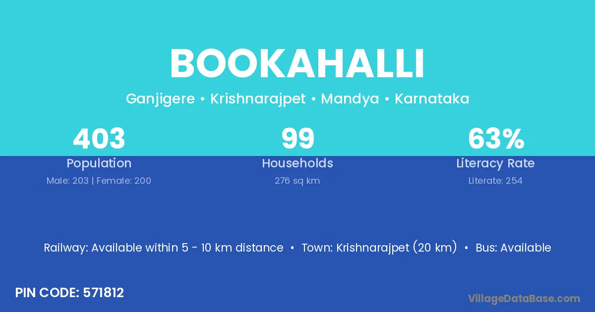 Krishnarajpet (20 km) is the nearest town to Bookahalli village for major economic activities and is located approximately 20 km away.