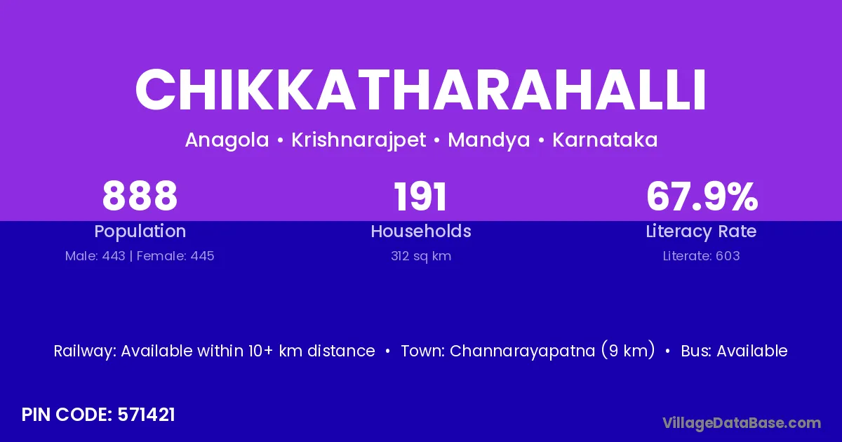 Chikkatharahalli village has a total population of 888 people, of which 443 are males and 445 are females.