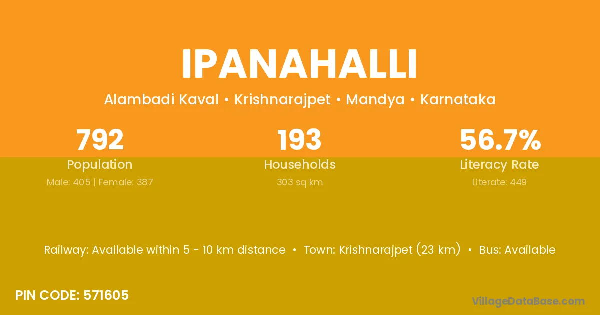 Krishnarajpet (23 km) is the nearest town to Ipanahalli village for major economic activities and is located approximately 23 km away.