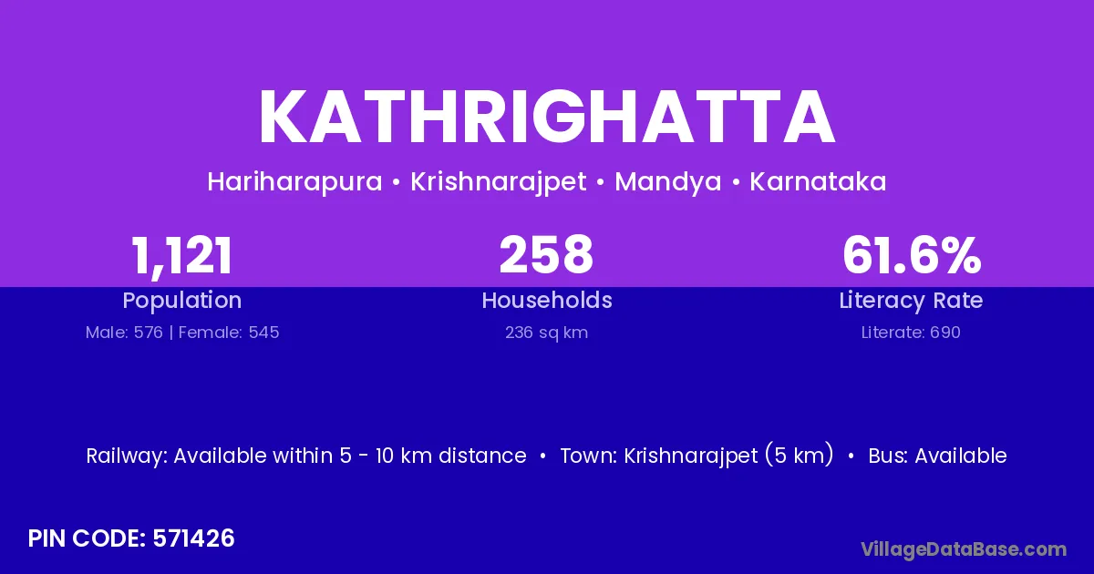 Krishnarajpet (5 km) is the nearest town to Kathrighatta village for major economic activities and is located approximately 5 km away.