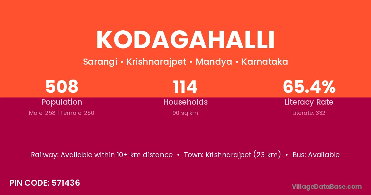 Kodagahalli village has a total population of 508 people, of which 258 are males and 250 are females.