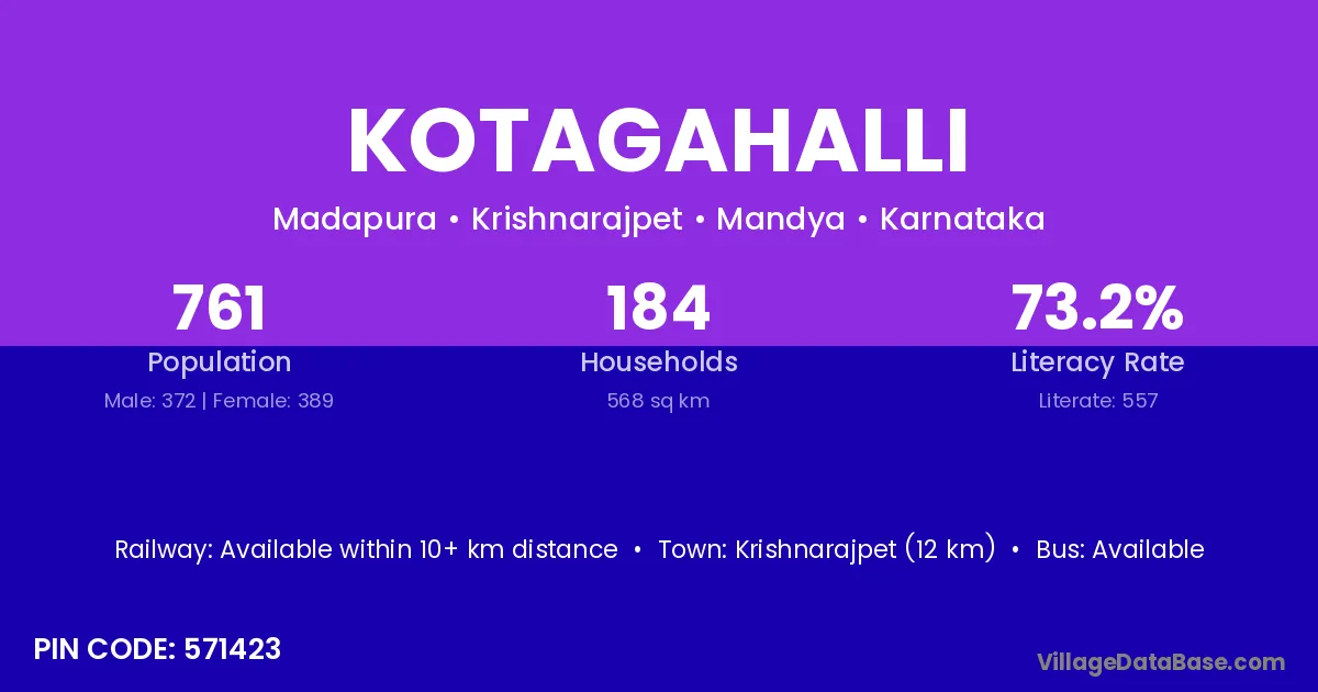 Krishnarajpet (12 km) is the nearest town to Kotagahalli village for major economic activities and is located approximately 12 km away.