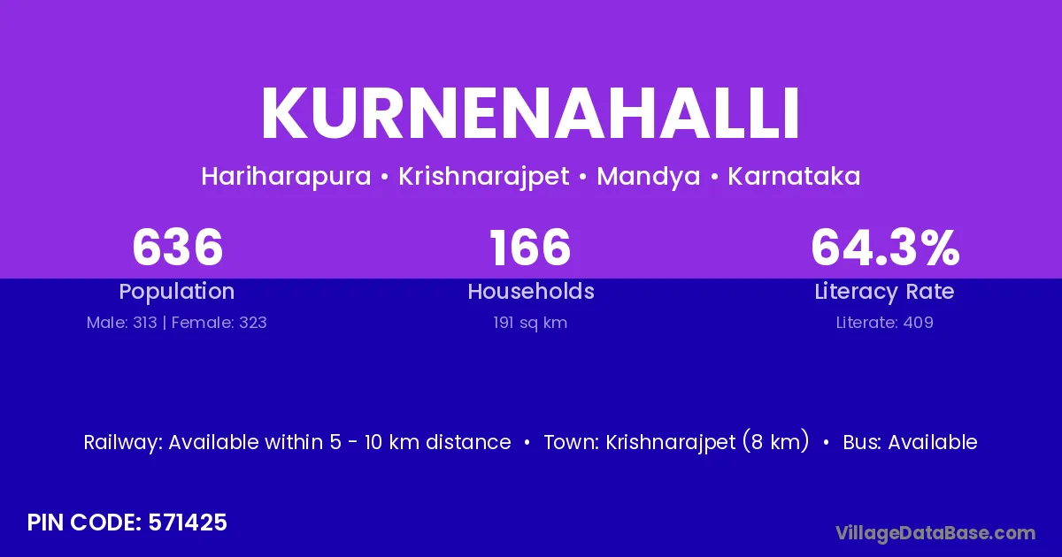 Krishnarajpet (8 km) is the nearest town to Kurnenahalli village for major economic activities and is located approximately 8 km away.