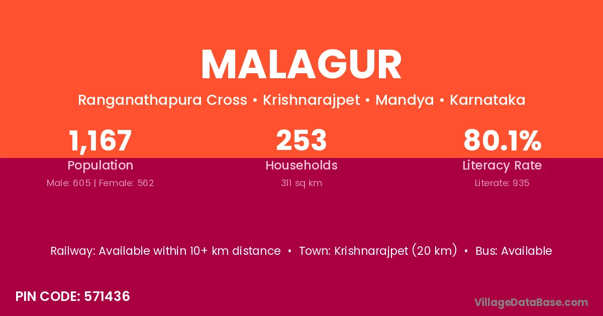 Krishnarajpet (20 km) is the nearest town to Malagur village for major economic activities and is located approximately 20 km away.