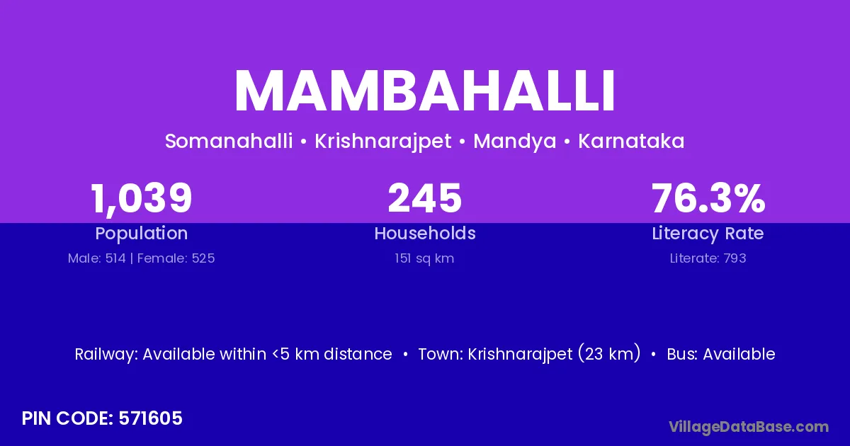 Krishnarajpet (23 km) is the nearest town to Mambahalli village for major economic activities and is located approximately 23 km away.