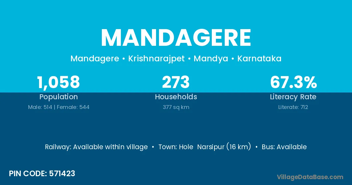 Hole Narsipur (16 km) is the nearest town to Mandagere village for major economic activities and is located approximately 16 km away.