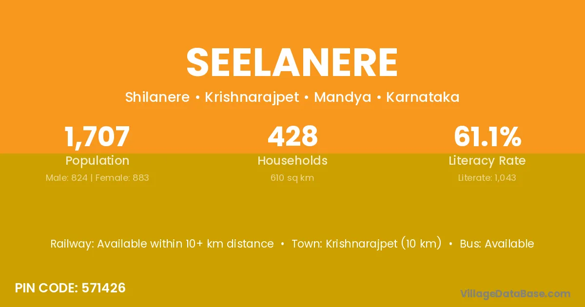 Krishnarajpet (10 km) is the nearest town to Seelanere village for major economic activities and is located approximately 10 km away.