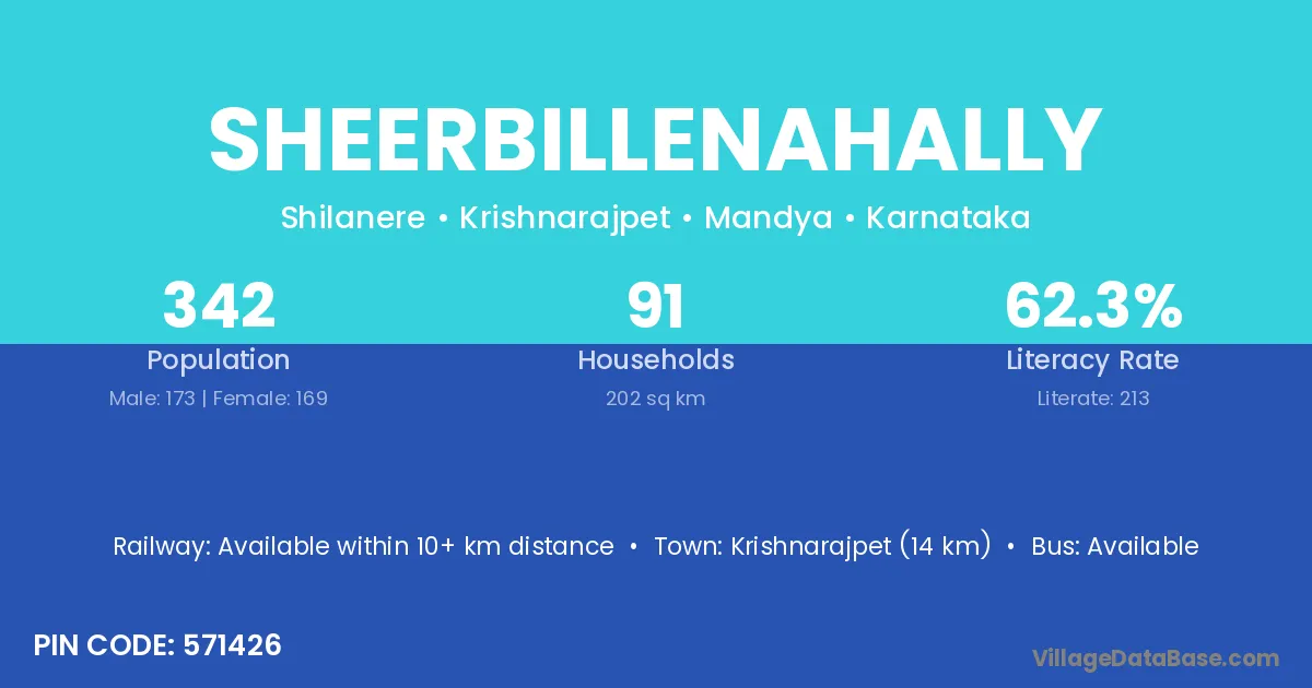Krishnarajpet (14 km) is the nearest town to Sheerbillenahally village for major economic activities and is located approximately 14 km away.