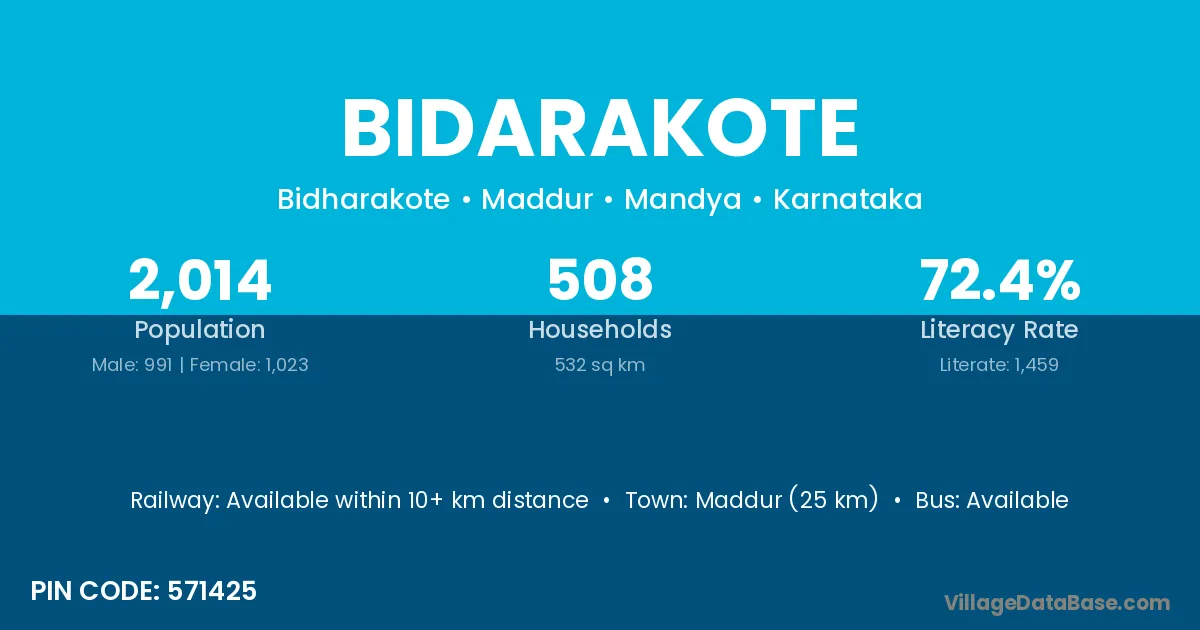 Maddur (25 km) is the nearest town to Bidarakote village for major economic activities and is located approximately 25 km away.