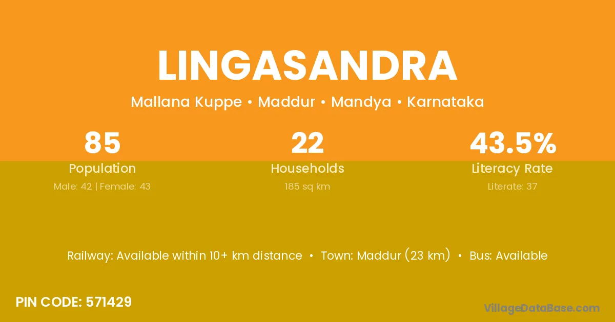Maddur (23 km) is the nearest town to Lingasandra village for major economic activities and is located approximately 23 km away.