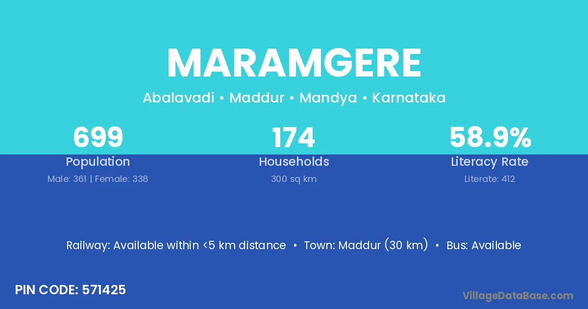 Maddur (30 km) is the nearest town to Maramgere village for major economic activities and is located approximately 30 km away.