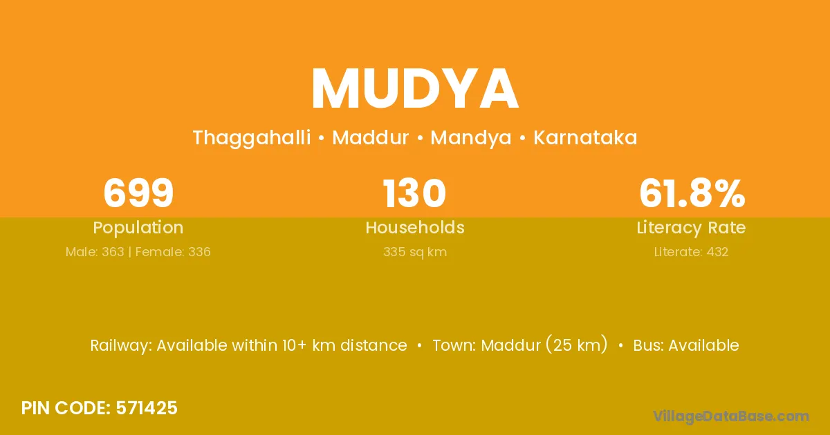 Maddur (25 km) is the nearest town to Mudya village for major economic activities and is located approximately 25 km away.