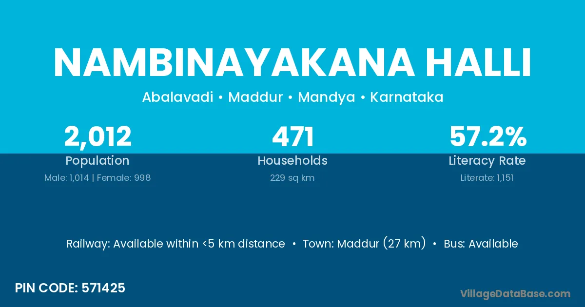 Maddur (27 km) is the nearest town to Nambinayakana Halli village for major economic activities and is located approximately 27 km away.