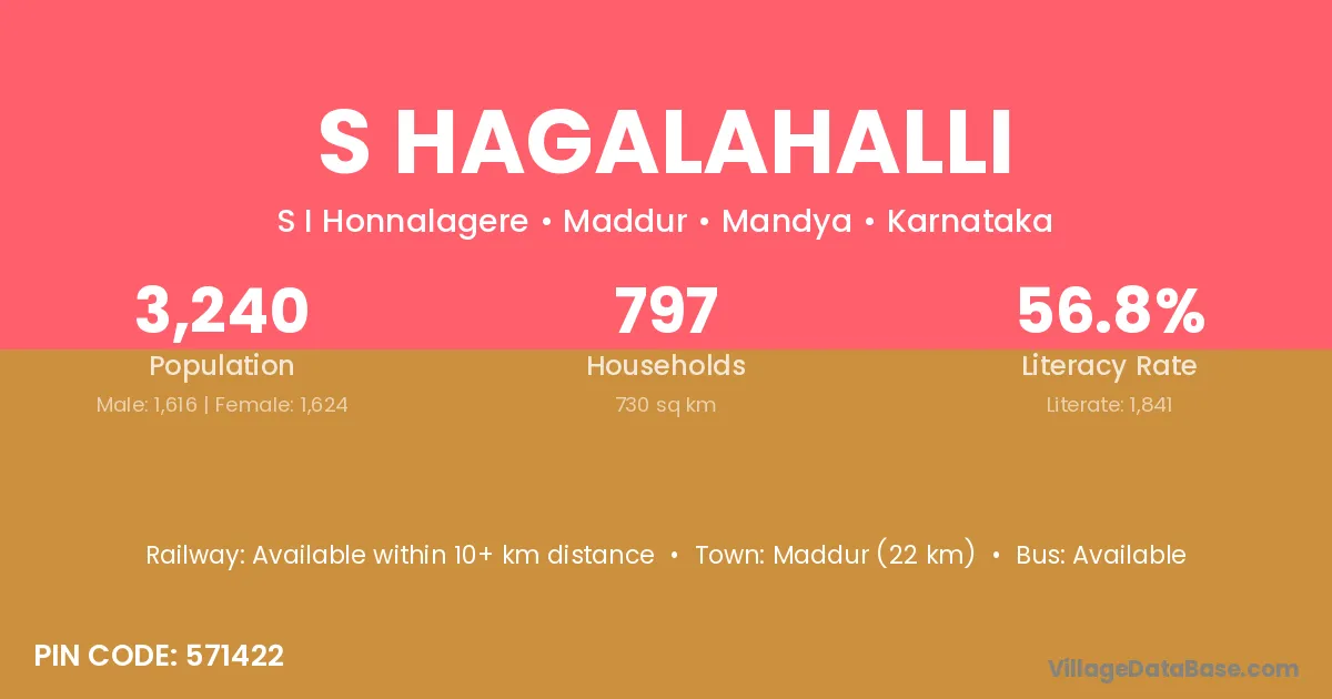Maddur (22 km) is the nearest town to S Hagalahalli village for major economic activities and is located approximately 22 km away.