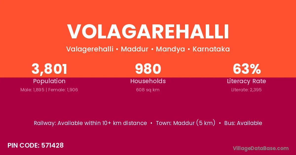 Maddur (5 km) is the nearest town to Volagarehalli village for major economic activities and is located approximately 5 km away.