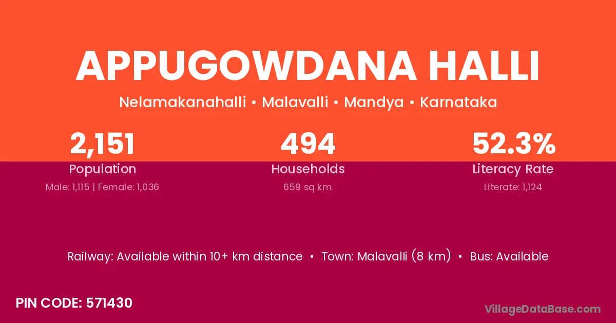 Malavalli (8 km) is the nearest town to Appugowdana Halli village for major economic activities and is located approximately 8 km away.