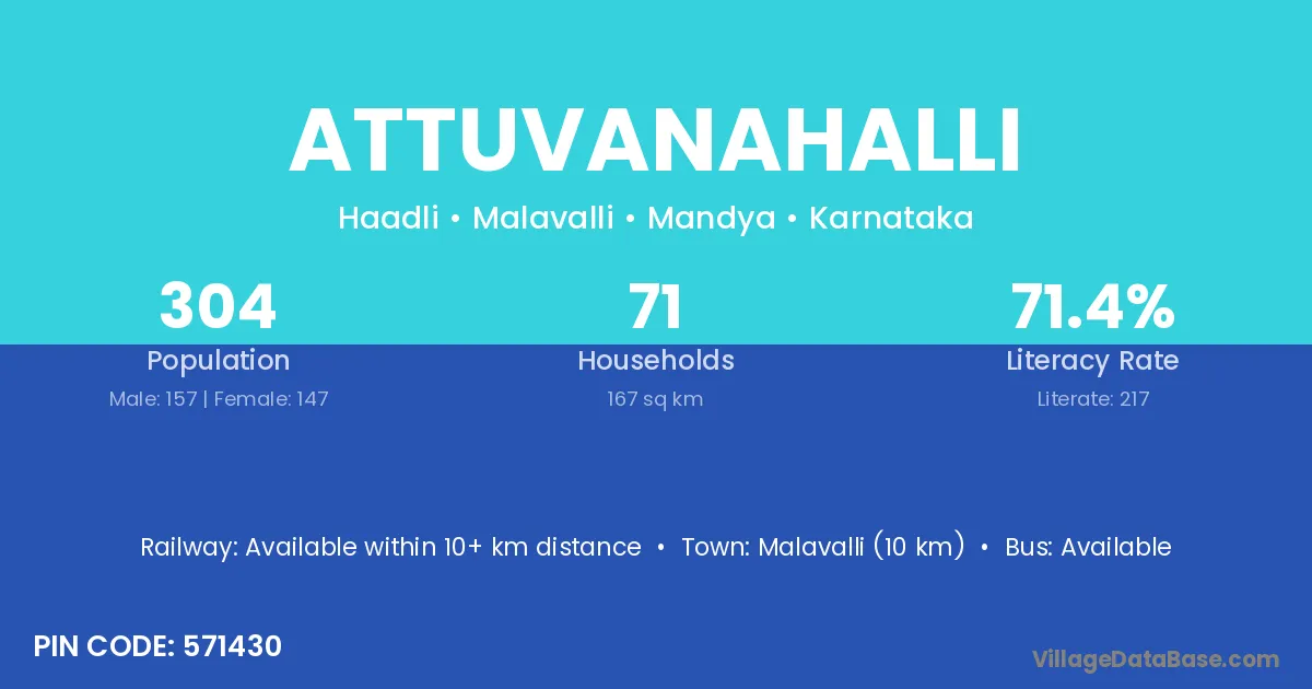 Malavalli (10 km) is the nearest town to Attuvanahalli village for major economic activities and is located approximately 10 km away.