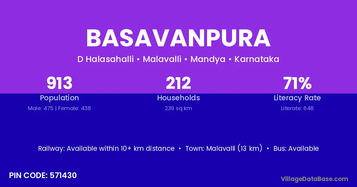 Malavalli (13 km) is the nearest town to Basavanpura village for major economic activities and is located approximately 13 km away.