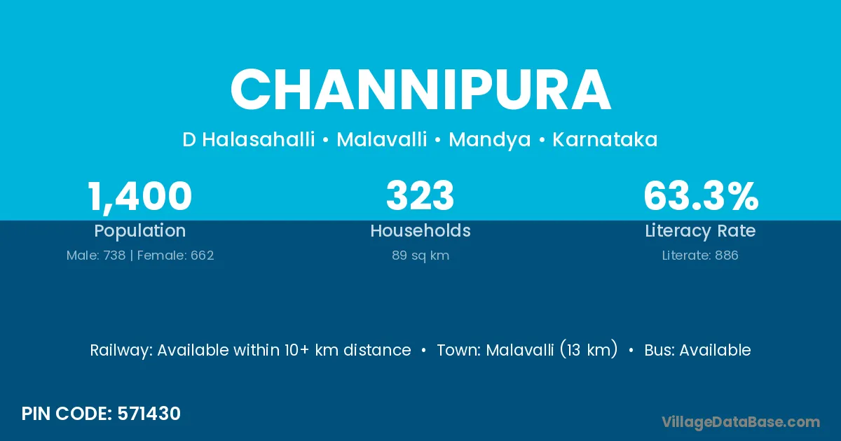 Malavalli (13 km) is the nearest town to Channipura village for major economic activities and is located approximately 13 km away.