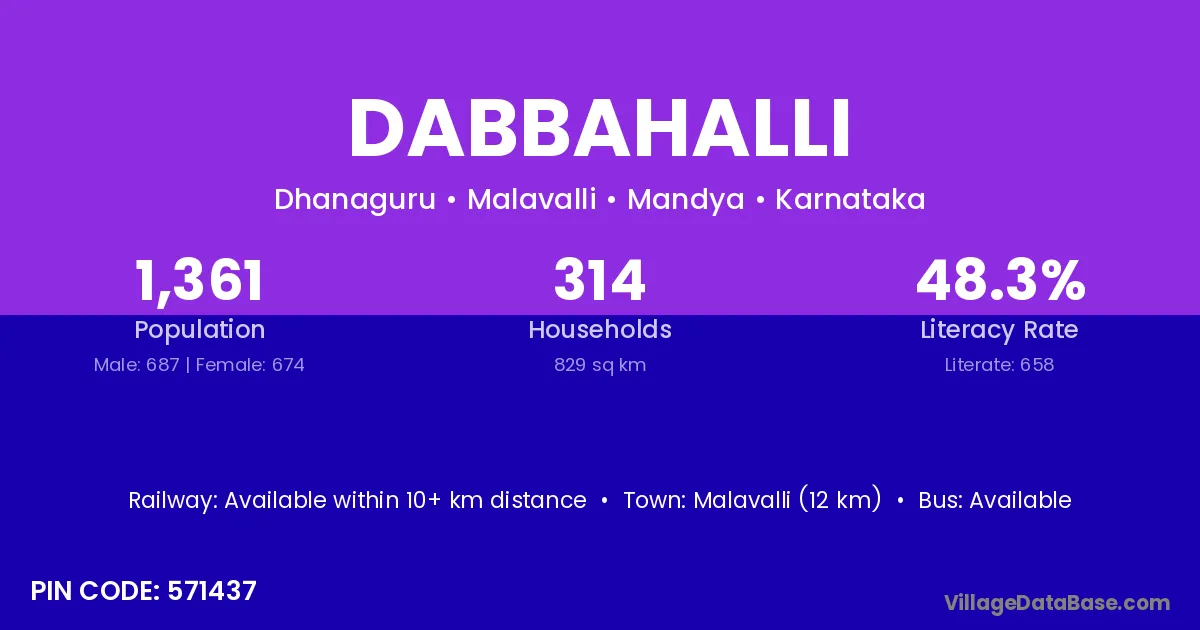 Malavalli (12 km) is the nearest town to Dabbahalli village for major economic activities and is located approximately 12 km away.