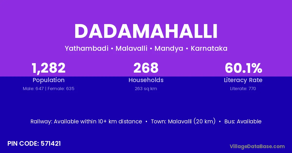 Malavalli (20 km) is the nearest town to Dadamahalli village for major economic activities and is located approximately 20 km away.