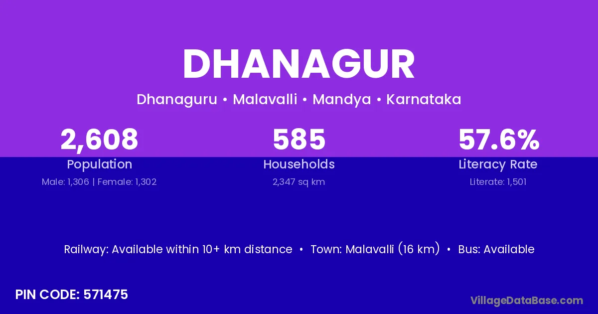 Malavalli (16 km) is the nearest town to Dhanagur village for major economic activities and is located approximately 16 km away.