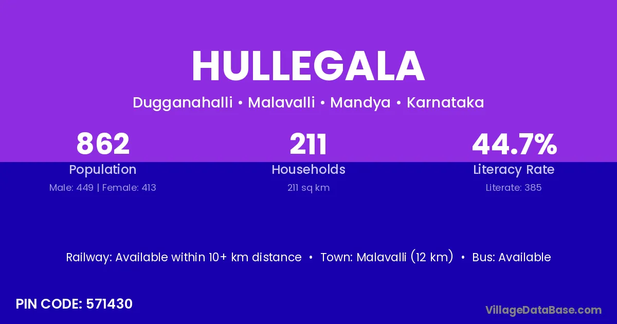 Malavalli (12 km) is the nearest town to Hullegala village for major economic activities and is located approximately 12 km away.