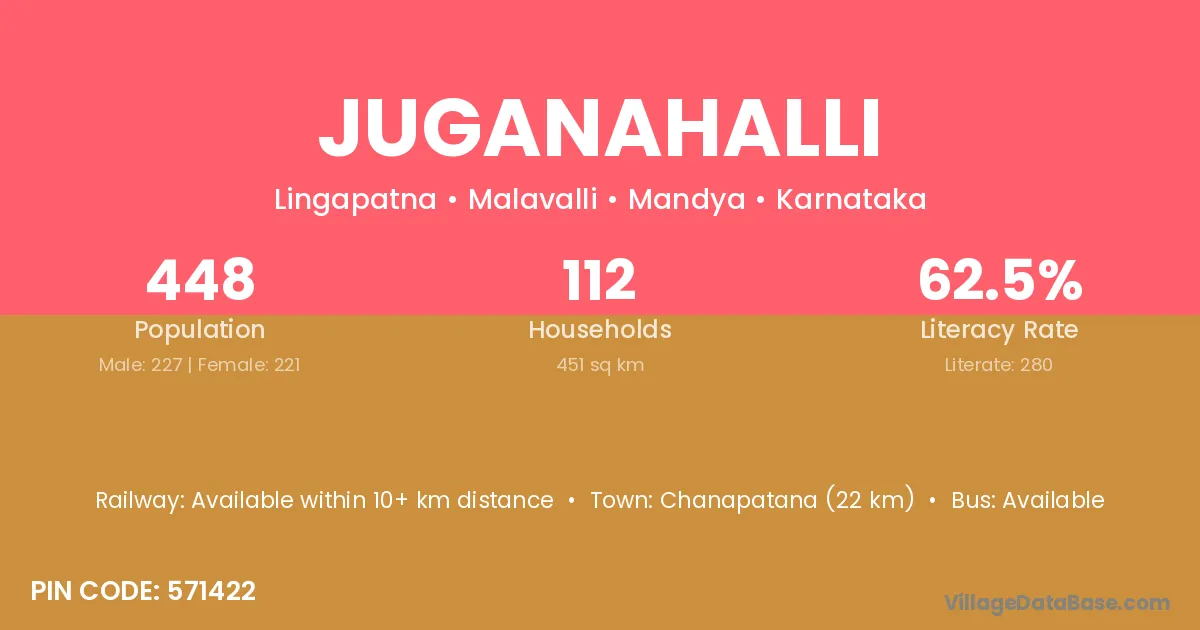 Juganahalli village has a total population of 448 people, of which 227 are males and 221 are females.