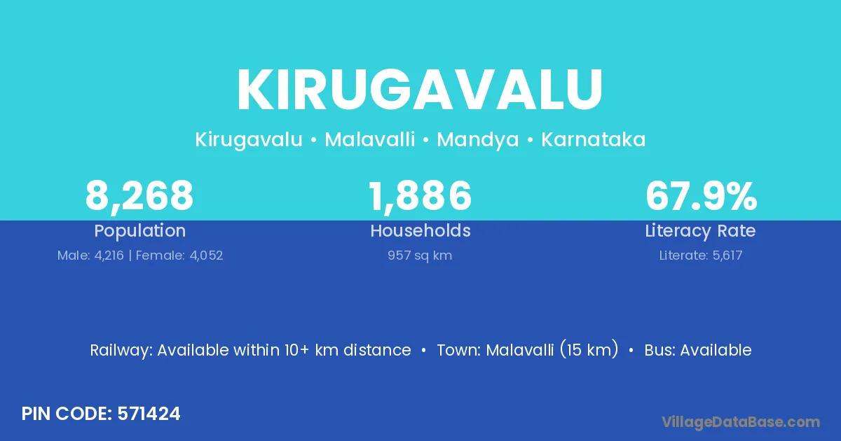 Malavalli (15 km) is the nearest town to Kirugavalu village for major economic activities and is located approximately 15 km away.