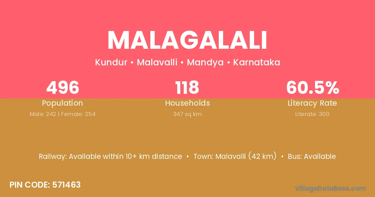 Malavalli (42 km) is the nearest town to Malagalali village for major economic activities and is located approximately 42 km away.