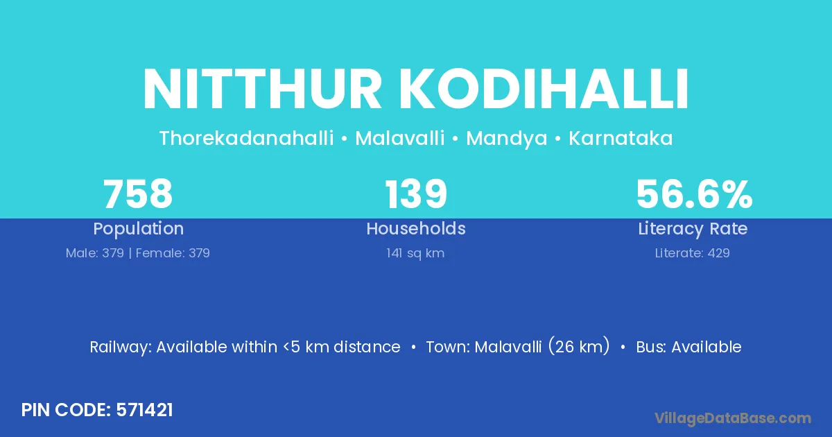 Malavalli (26 km) is the nearest town to Nitthur Kodihalli village for major economic activities and is located approximately 26 km away.