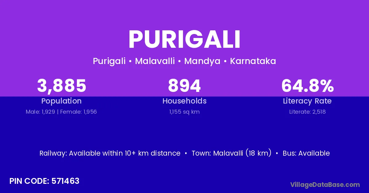 Malavalli (18 km) is the nearest town to Purigali village for major economic activities and is located approximately 18 km away.