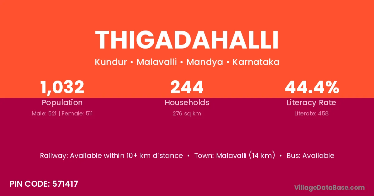 Malavalli (14 km) is the nearest town to Thigadahalli village for major economic activities and is located approximately 14 km away.