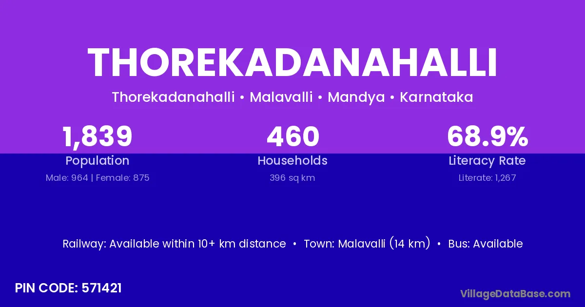 Malavalli (14 km) is the nearest town to Thorekadanahalli village for major economic activities and is located approximately 14 km away.