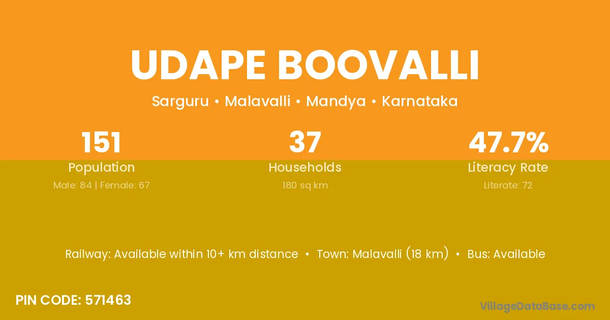 Malavalli (18 km) is the nearest town to Udape Boovalli village for major economic activities and is located approximately 18 km away.
