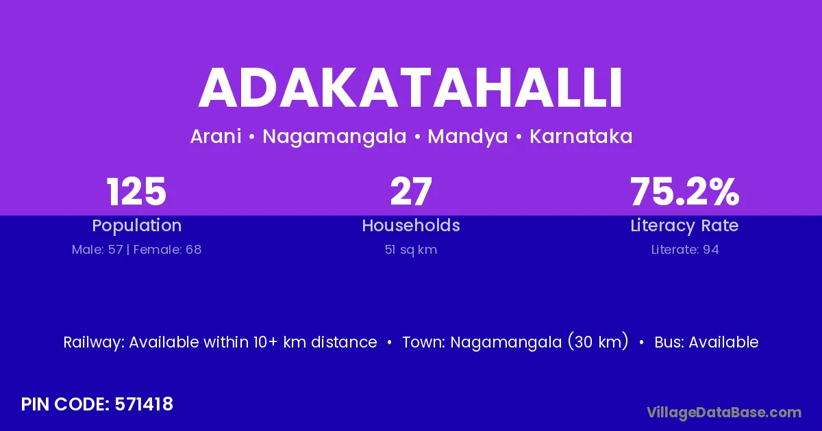 Nagamangala (30 km) is the nearest town to Adakatahalli village for major economic activities and is located approximately 30 km away.