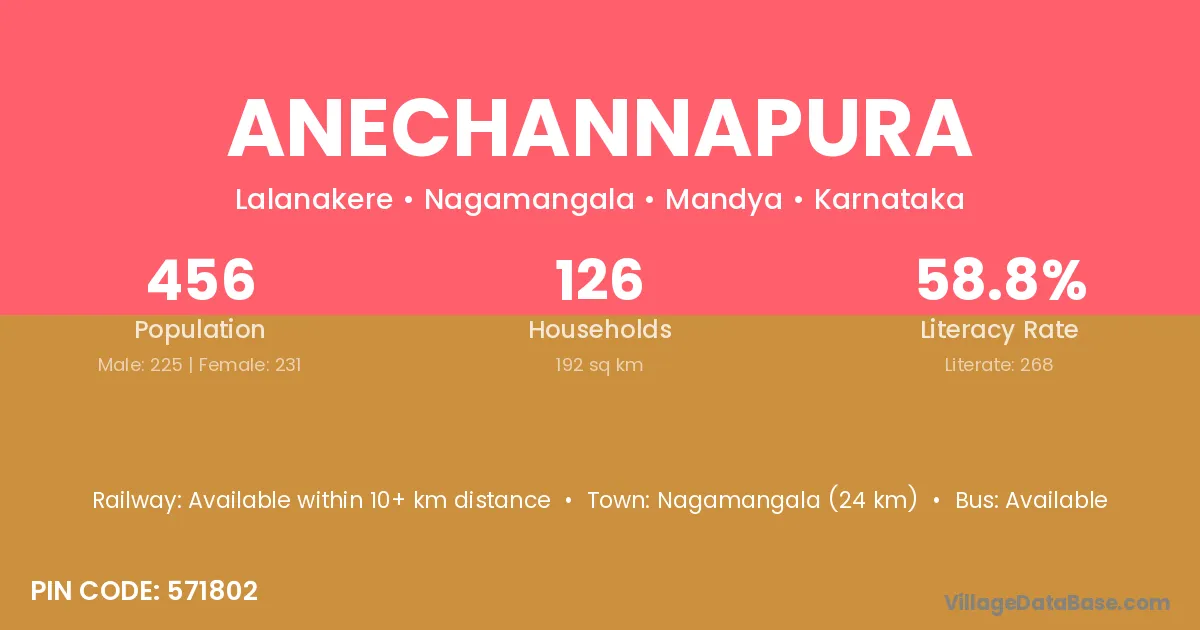 Nagamangala (24 km) is the nearest town to Anechannapura village for major economic activities and is located approximately 24 km away.
