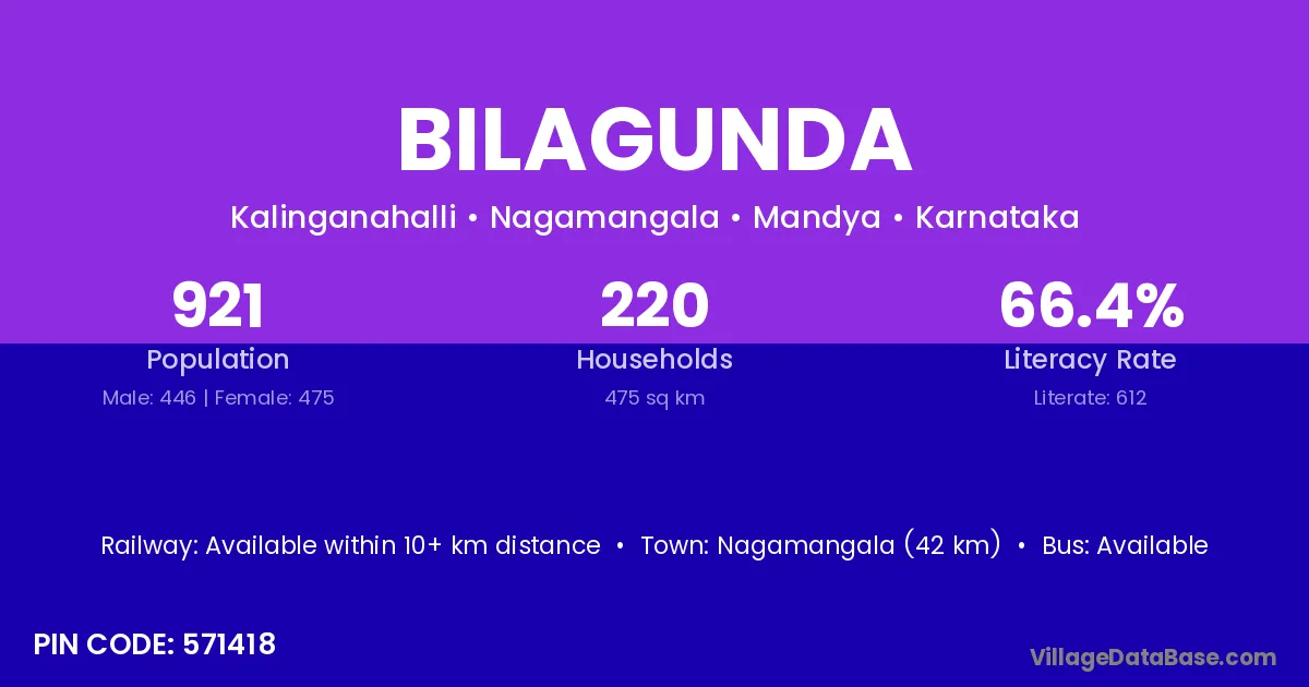 Nagamangala (42 km) is the nearest town to Bilagunda village for major economic activities and is located approximately 42 km away.