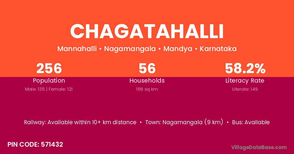 Chagatahalli village has a total population of 256 people, of which 135 are males and 121 are females.