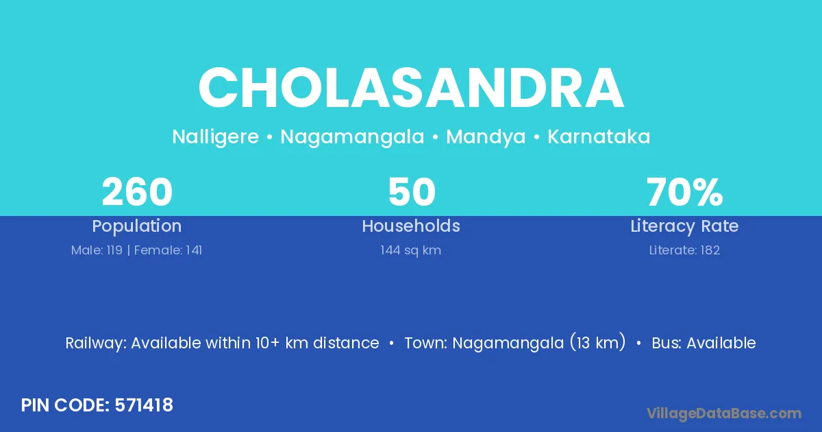 Nagamangala (13 km) is the nearest town to Cholasandra village for major economic activities and is located approximately 13 km away.