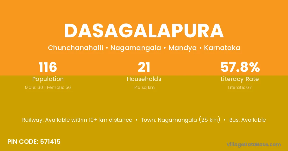 Dasagalapura village has a total population of 116 people, of which 60 are males and 56 are females.