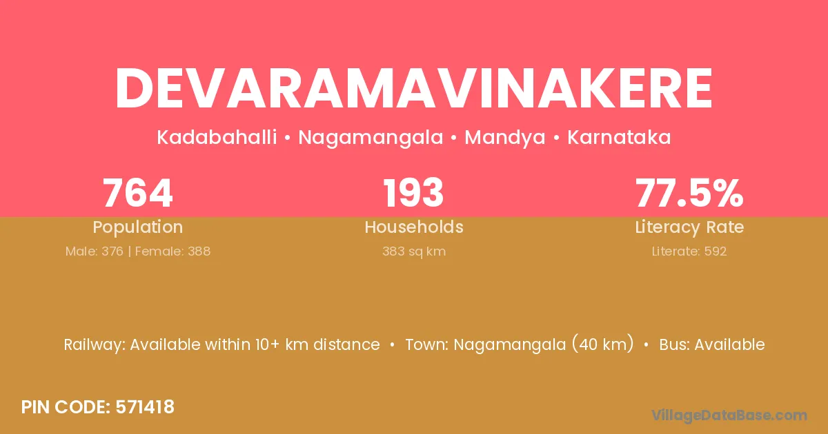 Devaramavinakere village has a total population of 764 people, of which 376 are males and 388 are females.