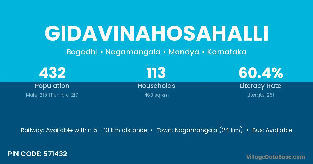 Gidavinahosahalli village has a total population of 432 people, of which 215 are males and 217 are females.