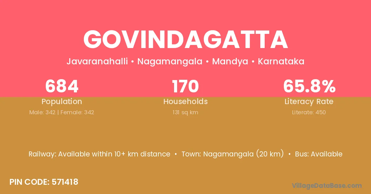 Govindagatta village has a total population of 684 people, of which 342 are males and 342 are females.
