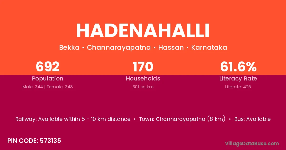 Hadenahalli village has a total population of 614 people, of which 308 are males and 306 are females.