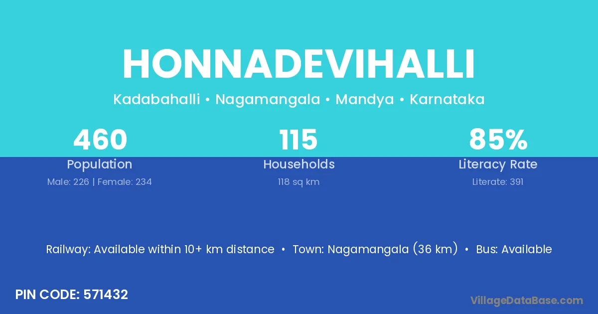 Nagamangala (36 km) is the nearest town to Honnadevihalli village for major economic activities and is located approximately 36 km away.