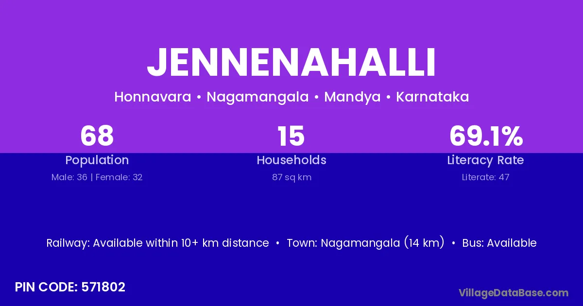 Nagamangala (14 km) is the nearest town to Jennenahalli village for major economic activities and is located approximately 14 km away.