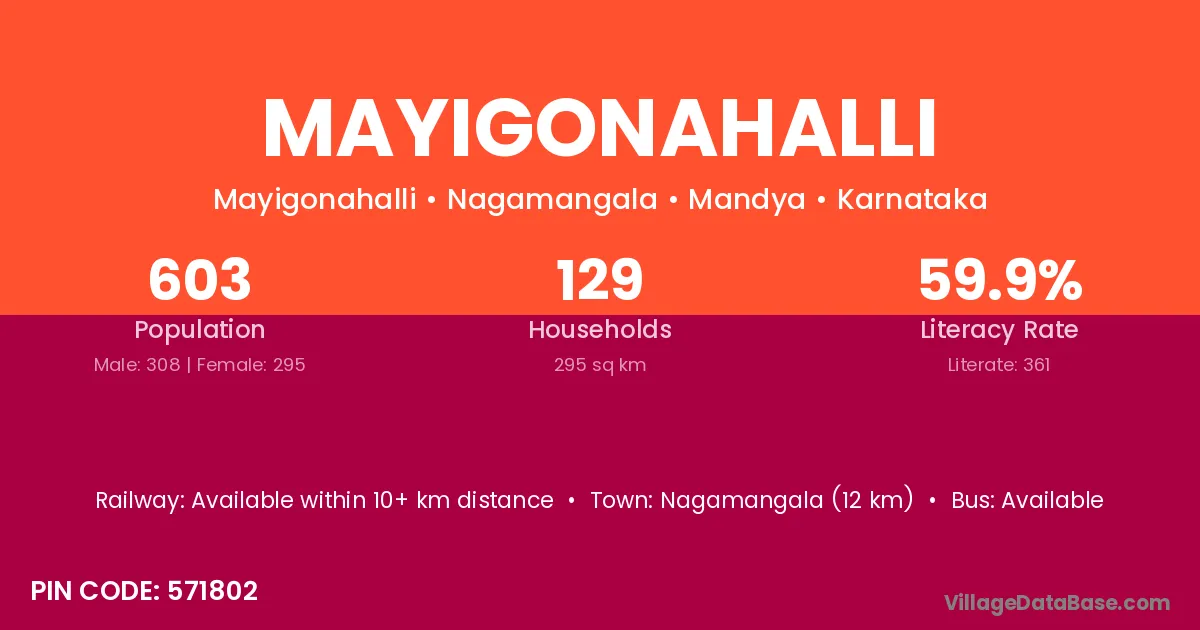 Mayigonahalli village has a total population of 603 people, of which 308 are males and 295 are females.