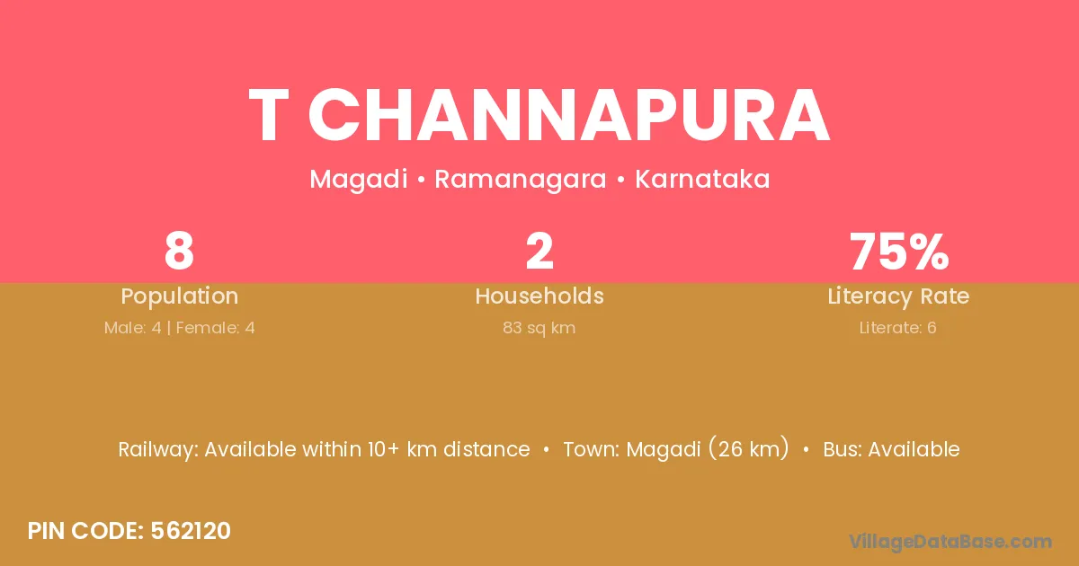 Nagamangala (16 km) is the nearest town to T Channapura village for major economic activities and is located approximately 16 km away.