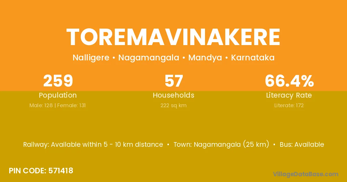 Nagamangala (25 km) is the nearest town to Toremavinakere village for major economic activities and is located approximately 25 km away.